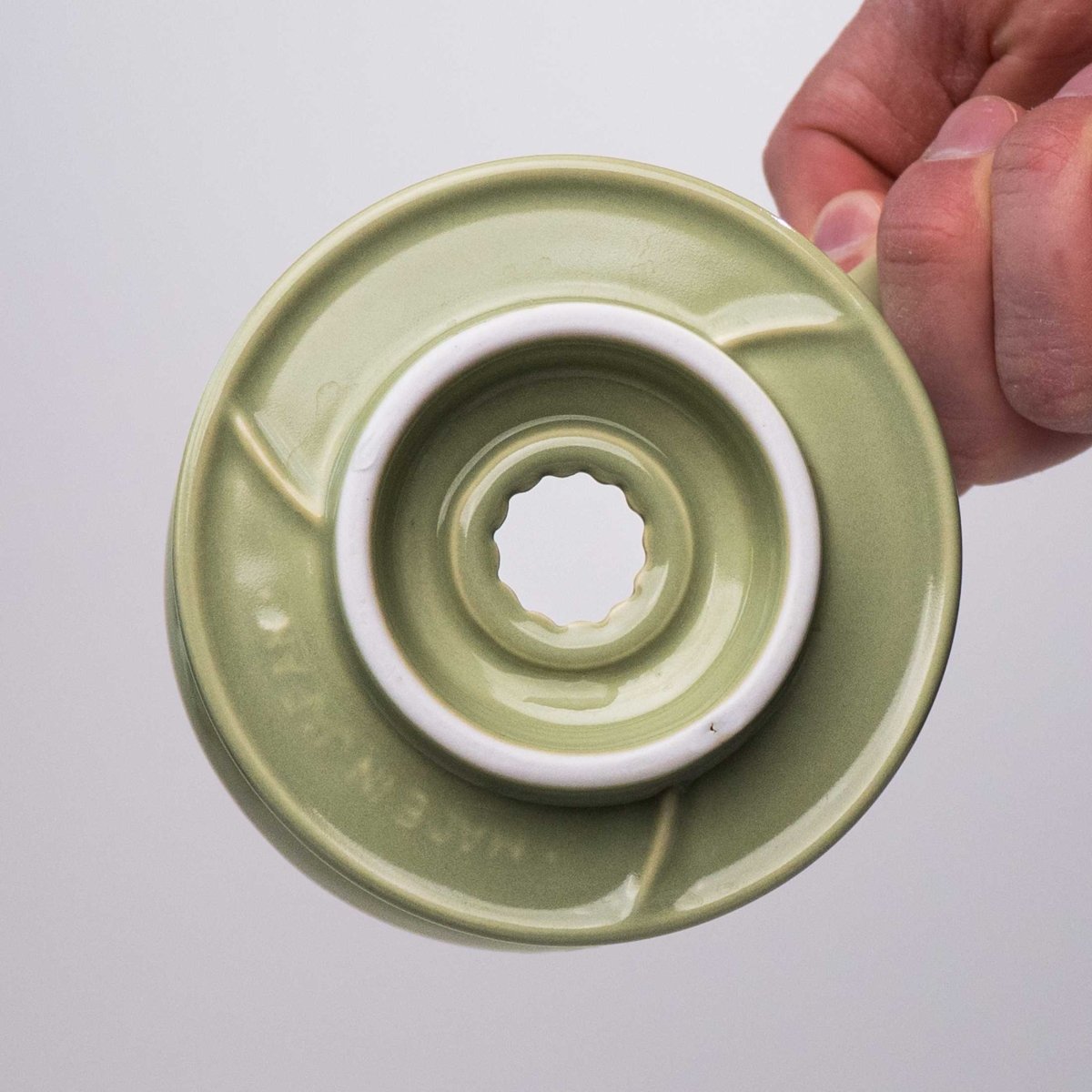 Der V60 hat keine kleinen Löcher beim Durchlauf, sondern ein großes Loch in der Mitte. Ebenso befinden sich Rillen an der Innenseite des Keramikfilters. Dadurch lässt sich die Extraktion des Kaffees besser steuern. Das Ergebnis ist besser.
